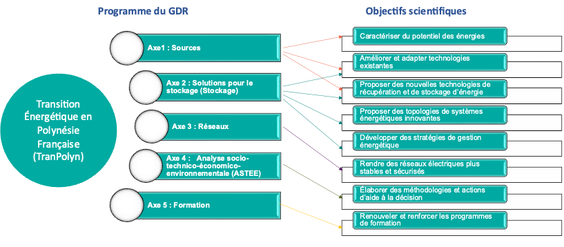 Le GDR TranPolyn propose d’exploiter 5 axes en lien avec la transition énergétique à Polynésie Française.